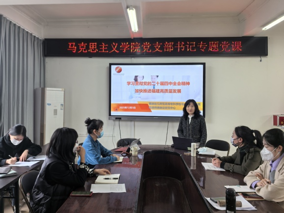 为深入学习贯彻党的二十届四中全会精神,切实把思想和行动统一到党中央的决策部署上来,12月3日下午,马克思主义学院党支部于学院会议室开展学习贯彻党的二十届四中全会精神专题党课暨交流研讨会。会议由党支部书记伊文婷主持并主讲,学院全体党员教师参加。