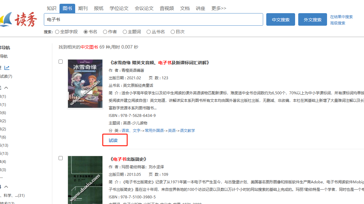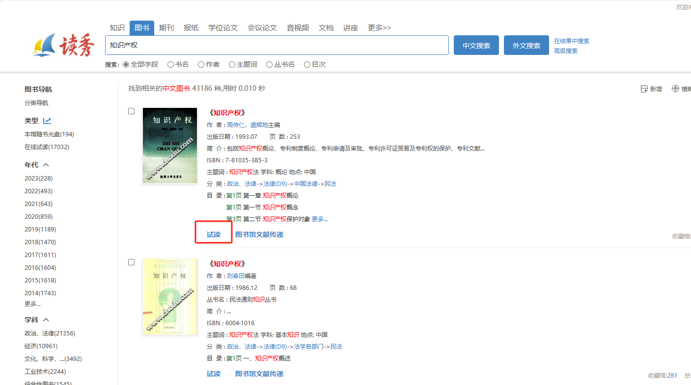 搜索任意关键词,点击检索结果中包含“试读”的功能按钮