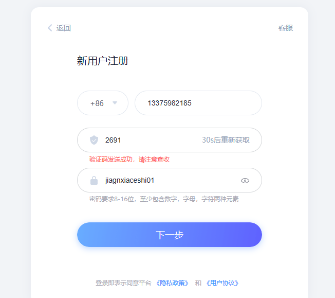 4.点击“新用户注册”,输入手机号、验证码、密码,点击下一步。