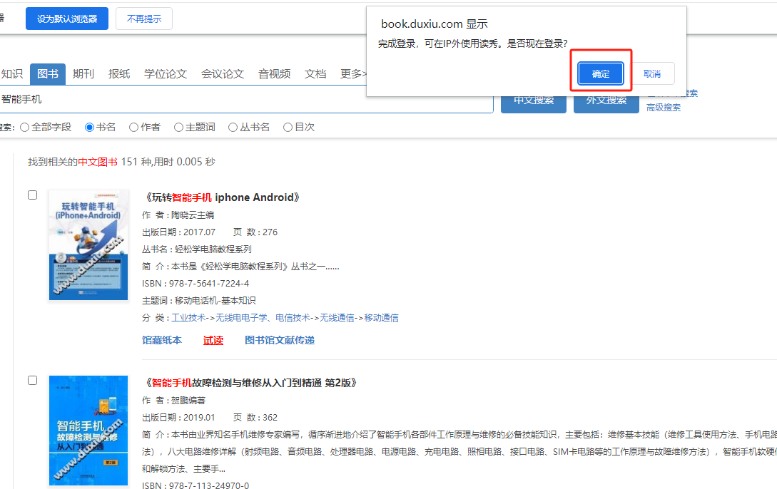 搜索任意主题词,选择含“试读”功能的按钮,提示“book.duxiu.com显示”,点击“确定,完成登录。