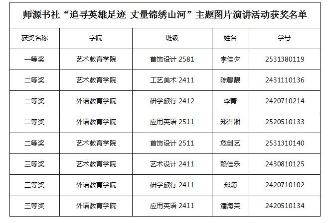 为了领略山河美,弘扬伟大抗战精神,纪念中国人民抗日战争暨世界反法西斯战争胜利80周年,师源书社近期在金山校区举办了“追寻英雄足迹,丈量锦绣山河”主题图片演讲活动。外语学院辅导员郑洁菲老师,书社指导老师钟丽锋,社长林琦琪同学担任评委。