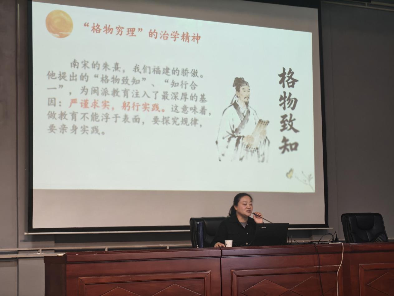 讲座中,薛教授以历史为轴,串联起闽派教育史上的璀璨星河:朱熹“格物致知、知行合一”的教育智慧,奠定闽派教育的思想根基;林则徐“苟利国家生死以”的家国情怀,诠释教育的责任担当;严复“开民智、兴民权”的革新理念,推动教育向近代化跨越;冰心“爱与奉献”的教育温情,彰显教育的人文底色……一段段深邃思想、一个个鲜活典范,让在场师生深刻体会到闽派教育家精神的深厚内涵,感受到中华传统文化在教育领域的强大生命力,进一步坚定了文化自信。