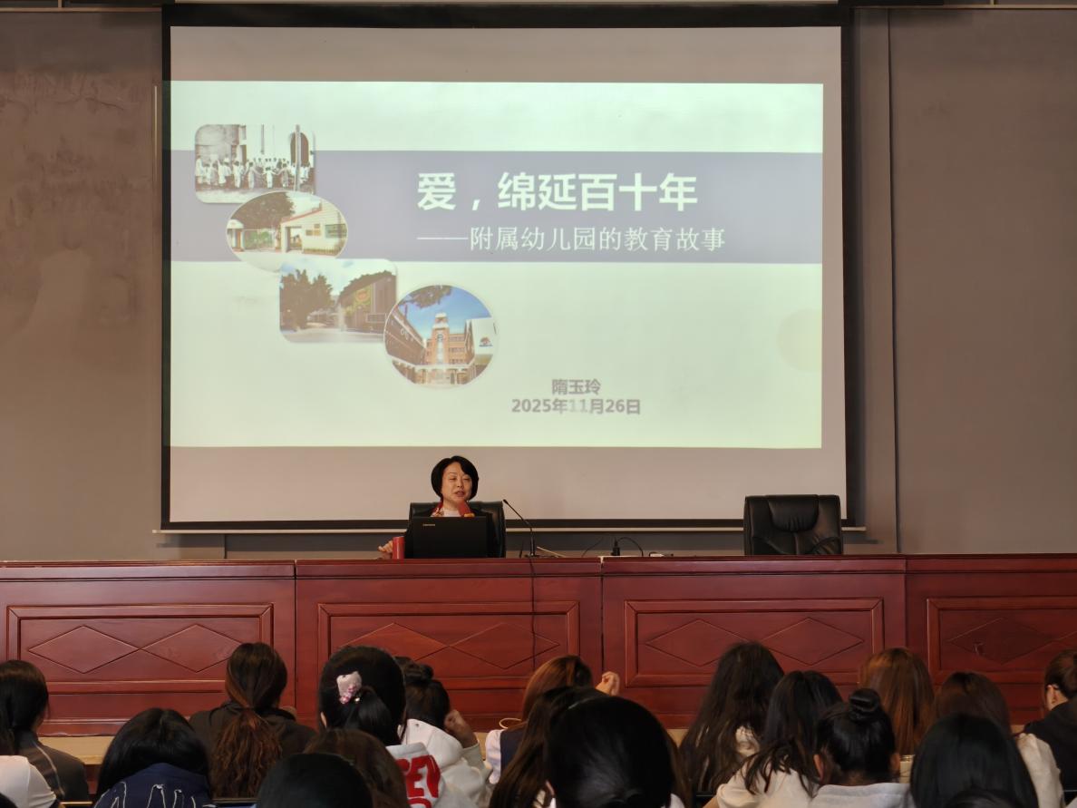讲座中,隋园长结合自身从普通教师成长为杰出人民教师的经历,深情回顾了附属幼儿园百十年发展历程中的温暖瞬间;生动讲述了几代教师以爱心耕耘的感人故事——青年教师“不是母亲,胜似母亲”般守护童真,中年教师为孩子的明天谱写教育诗篇,老教师则甘为人梯、悉心培育后辈。她还分享了来自幼儿与家长的暖心反馈,通过稚嫩的画作、童真的语言和真挚的感谢信,呈现了“以爱育爱”的教育理念如何在孩子心中生根发芽,形成温暖的家园共鸣。隋园长同时介绍了附属幼儿园始终坚持的“以人为本,以爱育爱”文化理念,以及培养“追求生活真与美的快乐儿童”的育人目标。