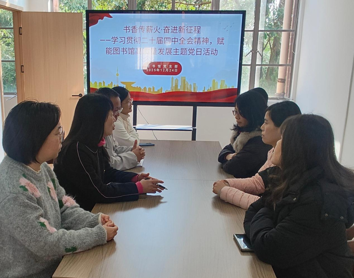 为深入学习贯彻党的二十届四中全会精神,推动全会部署在基层落地见效,12月24日下午,图书馆党支部在文脉书韵学习空间开展“书香传薪火·奋进新征程——学习贯彻二十届四中全会精神,赋能图书馆高质量发展”主题党日活动。活动由支部书记程英主持,全体党员参加。