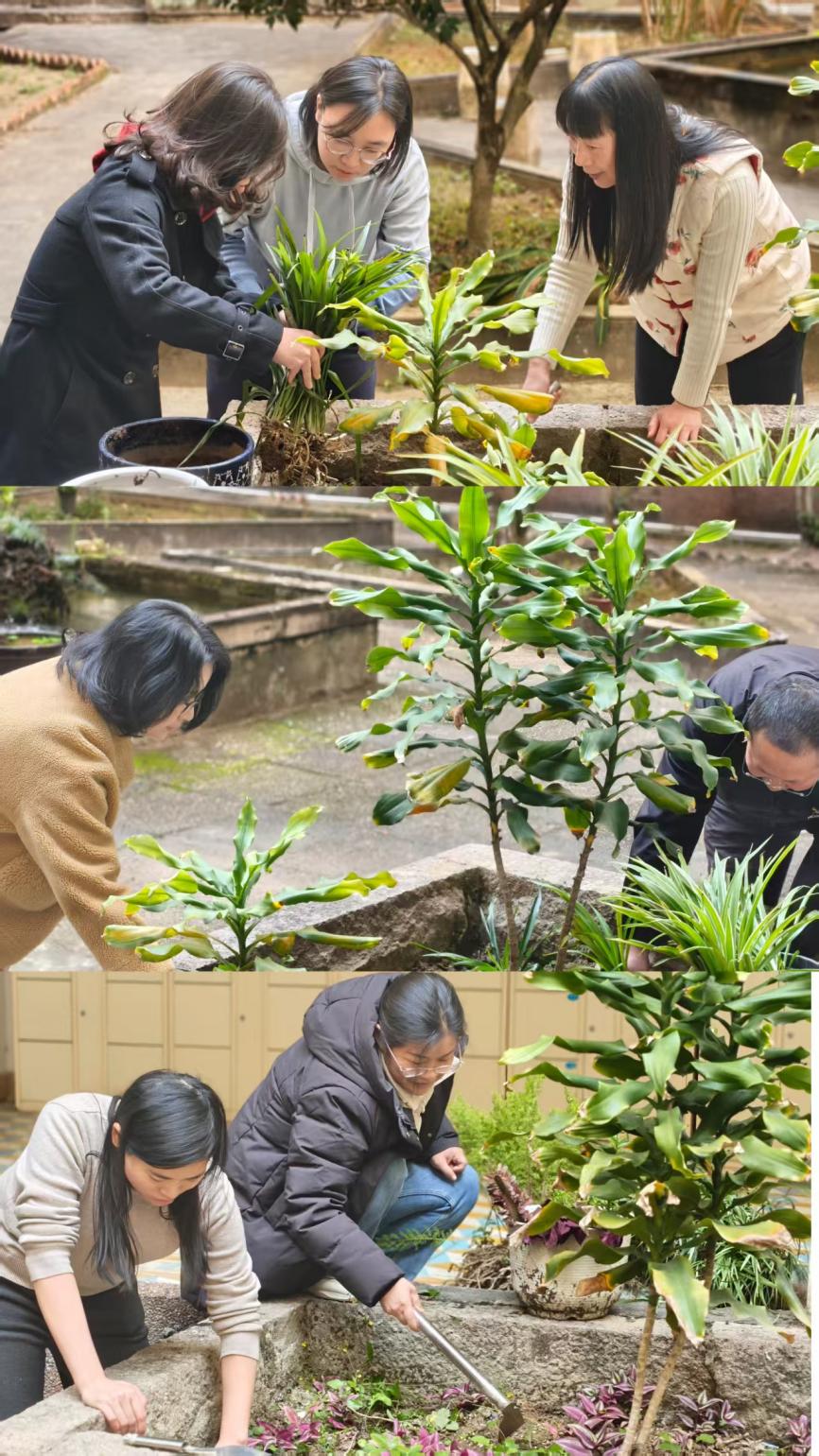 活动伊始,支部带领全体党员学习《全民阅读促进条例》核心内容,强调以优质阅读环境赋能全民阅读推广,让生态文明理念与书香文化相融共生。随后,全体党员齐聚图书馆天井,分工协作开展绿植焕新工作,大家挥锹培土、扶苗压实,有序补植麦冬、吊兰等绿植,同时对天井区域现有绿植进行松土、修剪养护,细致清理周边卫生死角,以实际行动为图书馆添绿增彩,让阅读空间更富生机。