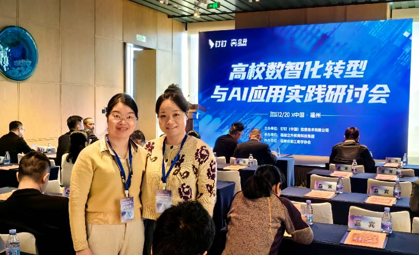 为深入推进人工智能与高等教育的融合发展,加速教育教学数字化转型与高质量发展,2025年12月20日上午,“高校数智化转型与AI应用实践研讨会”在福州中海凯丽酒店多功能厅隆重举行。本次会议汇聚了省内多所高校的领导、专家学者与一线教师,共同围绕人工智能重塑教育生态这一时代命题,展开深入交流与研讨。外语教育学院教师周小湣和林方彬应邀参会。