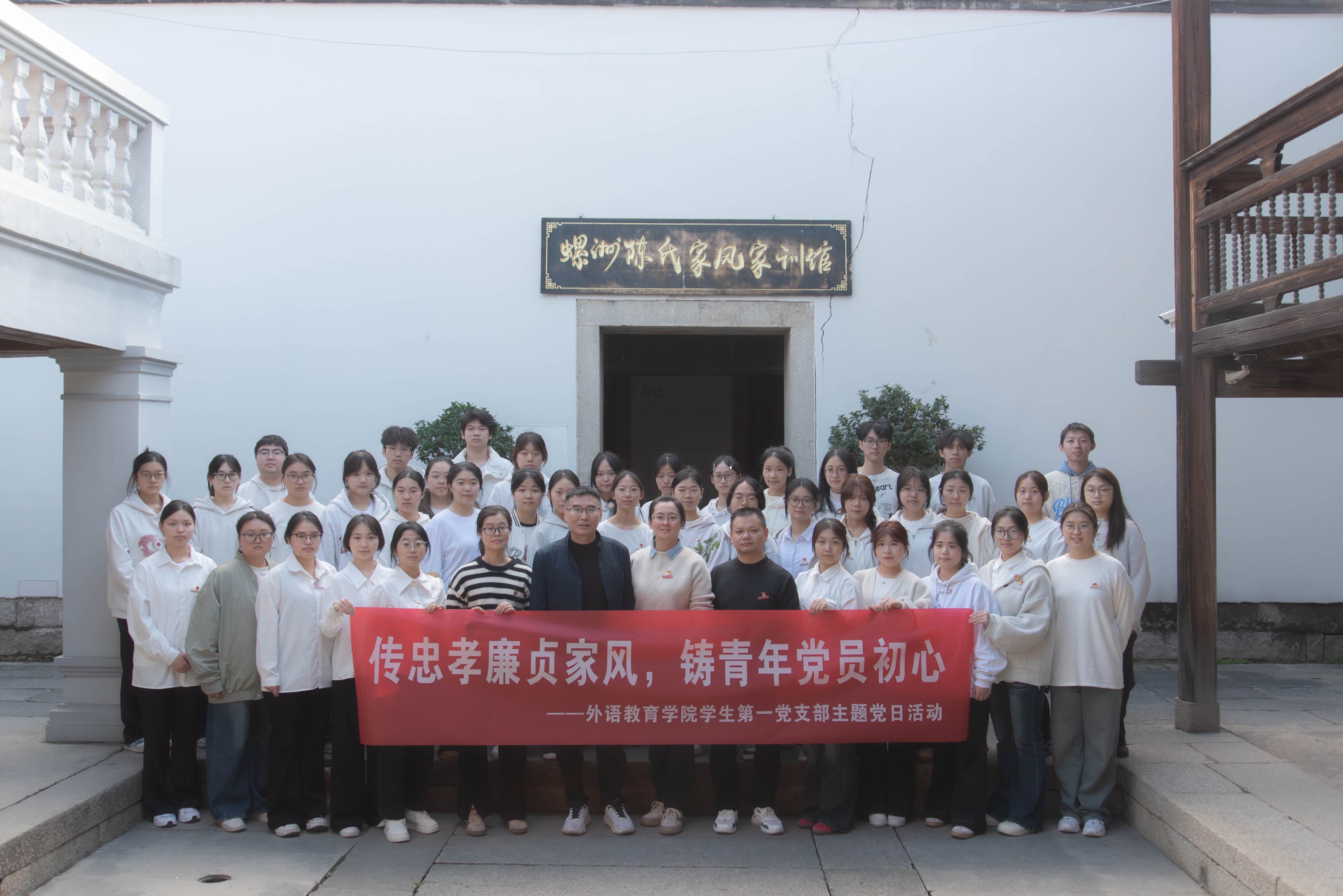 2025年12月17日,外语教育学院学生第一党支部组织全体党员、入党积极分子及学生干部,赴螺洲古镇陈宝琛故居、吴石广场开展“传忠孝廉贞家风,铸青年党员初心”主题党日活动,深耕清廉家风文化,筑牢青年党员廉洁修身初心。党总支书记王标全程参与,与支部党员一同学习研讨、交流感悟。