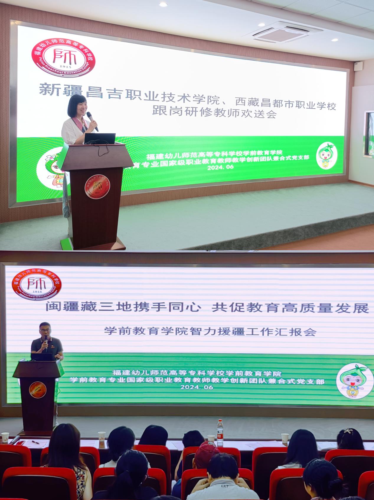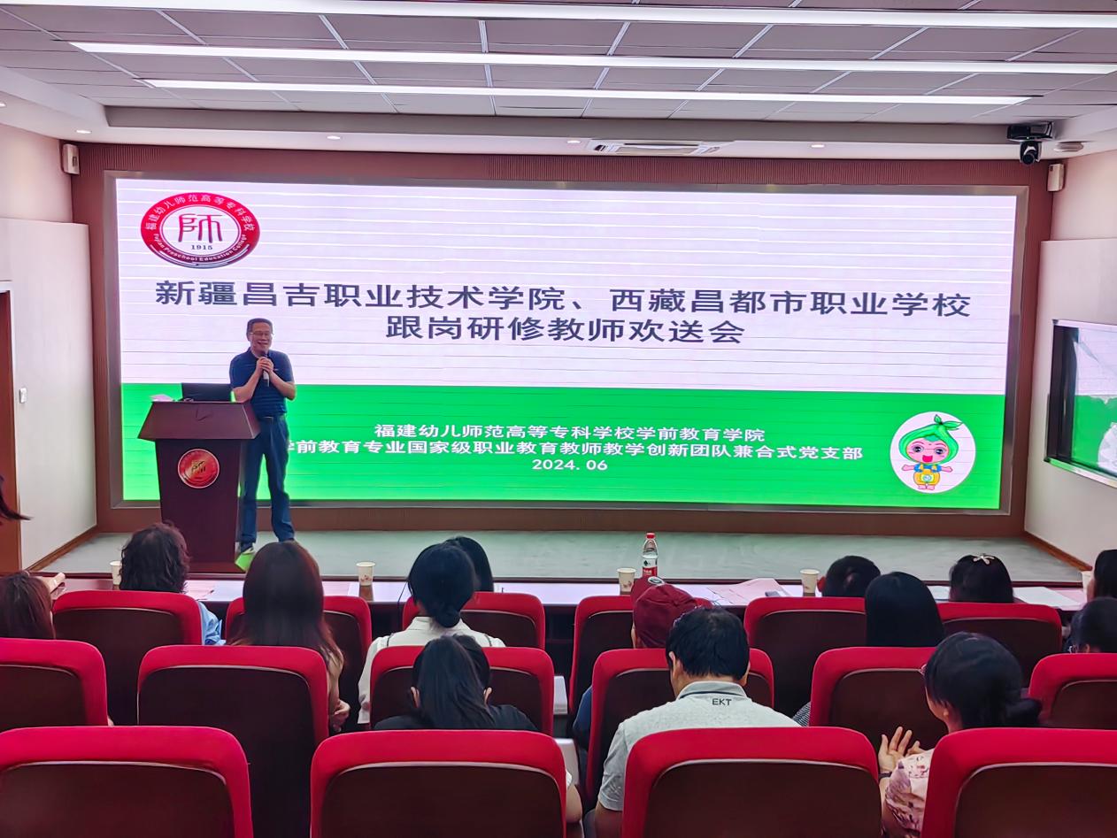 鲍仕梅书记代表校党委,对援疆教师的辛勤付出和取得成绩表示肯定,向新疆、西藏跟岗教师圆满完成研修任务表示祝贺,对学前学院领导老师给予的专业支持和无私分享表示感谢。他表示,我校坚持把践行教育援疆、援藏作为贯彻落实党的二十大关于“加快建设高质量教育体系”重大决策部署和不断铸牢中华民族共同体意识的具体行动,作为为党育人、为国育才的一项光荣而艰巨的使命。他希望闽疆、闽藏的山海情能进一步延续、传承、发扬,以更加紧密的合作携手共筑职教梦,为党和国家培养更多的优秀人才,提供更坚实的智力保障!