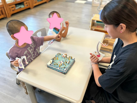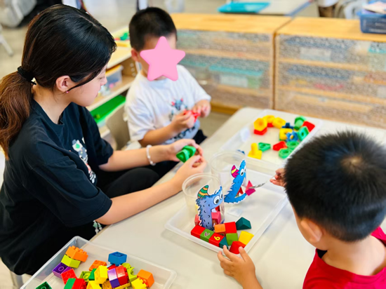 在集体教学中,实习生柯嘉雯等人协助教师开展针对幼儿认知、语言与社交能力的训练课程。以区域游戏为例,实习生重点参与了益智区的教学支持工作,如引导幼儿进行积木拼搭游戏,通过色彩鲜艳、形状各异的积木,帮助幼儿识别形状、分辨颜色,锻炼其手眼协调能力与空间认知能力;还组织了带有卡通元素的互动游戏,借助怪兽图案容器等教具,激发幼儿参与游戏的兴趣,在游戏中潜移默化地提升其专注力与规则意识。此外,在钓鱼主题游戏活动中,实习生与教师一同组织幼儿参与,利用趣味钓鱼教具,锻炼幼儿的手部精细动作与观察力,同时在互动中培养幼儿的社交能力与合作意识。