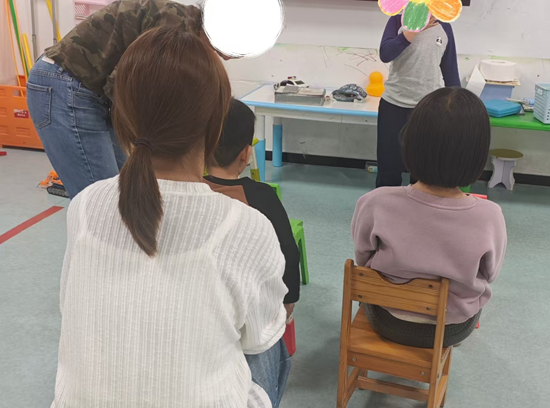 实习生观摩特殊儿童上小龄集体课并且进行教学辅助