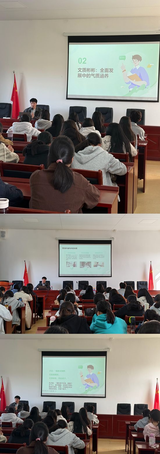 ”与“质”的平衡是成长的关键。梁天勇学长说到“质”为内在根基,需以经典阅读学习和社会主义核心价值观实践来沉淀修养;“文”是外化能力,可通过舞蹈、钢琴、美术等课程提升审美能力。他强调学前教育专业同学需文质双向赋能,借高雅艺术增厚人文底蕴,以得体言行匹配品格。他同时指出在发挥个人特长的同时,也需在集体协作中实现价值,鼓励跨学科实践与向榜样学习,在“个性”与“协作”间寻支点,让“文”的丰沛与“质”的坚实更好结合,助力大学生全面成长。