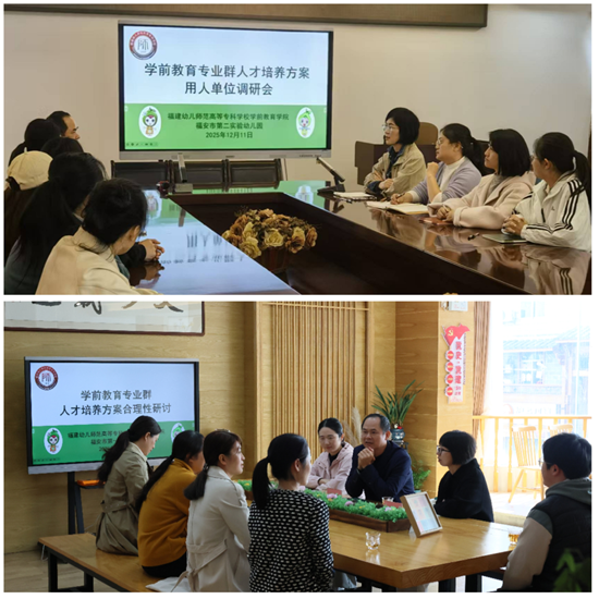 在福安市第一实验幼儿园与第二实验幼儿园,调研组与园方重点围绕少子化背景下学生就业与岗位实习、人才培养与课程体系、基地建设与协同发展深度对话,强调以托幼一体化衔接响应国家“幼有所育”向“幼有优育”的政策导向,推动普特融合落实教育公平;主张深度挖掘地方文化资源开发特色课程,借助数字赋能优化教学评价与家园共育,提升学生创新实践能力、课程设计能力以及数字素养 ;共商校—园资源互通机制,着力培养适应新形势的复合型人才。