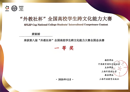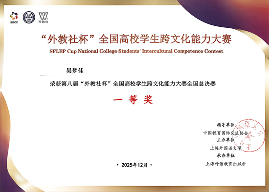 2025年12月,第八届“外教社杯”全国高校学生跨文化能力大赛全国总决赛在上海外国语大学圆满落幕。我院2023级学前教育专业吴梦佳、黄银娇两位同学,与外语教育学院小英专业肖雨彤同学组成参赛团队,代表学校与全国70余所本科高校精英团队同台竞技,凭借扎实的综合素养、出色的跨文化沟通能力及默契的团队协作,成功斩获全国一等奖,助力学校实现专科院校在该赛事中的历史性突破,充分彰显了我院学前教育专业学子全面发展的优良风貌与过硬的综合素质。