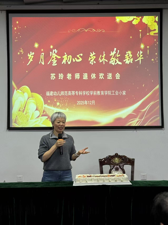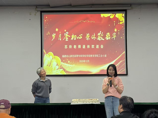 为致敬深耕教育、奉献韶华的老教师,传承尊师重教的优良传统,2025年12月20日,福建幼儿师范高等专科学校学前教育学院工会为苏玲老师举办退休欢送仪式。仪式由副院长、工会主席林萍主持,全体教职工齐聚一堂,为苏玲老师的教育生涯送上祝福。