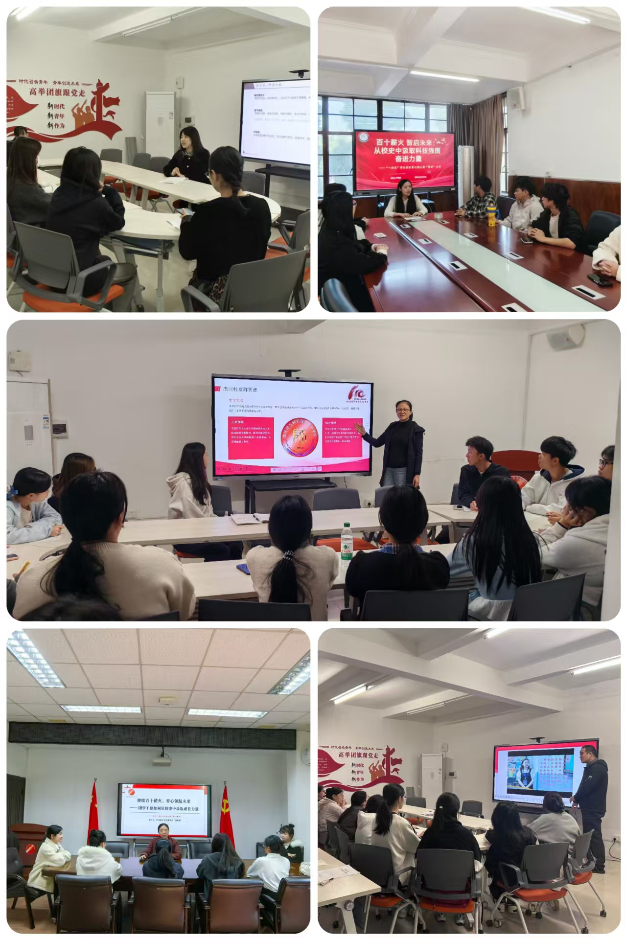 各学院围绕主题开展了主题分享+互动交流的“攀讲”活动,现场气氛热烈、互动踊跃,形成“师生共学、双向赋能”的良好氛围。活动现场亮点纷呈,学前教育学院赖联泓老师以“百十育爱重传承,薪火赓续勇担当”为主题,结合学前教育专业特色,强调以“爱”与“责任”为底色的育人使命,号召同学们在服务与奉献中锻造担当;艺术教育学院杨雨菲老师以“在校史长河中寻找青春坐标”为主线,带领学生回望学校百十年办学历程,鼓励同学们在专业学习与社会实践中校准青春航向;人文科学学院戴绍芳老师以“赓续百十薪火,育心领航未来——新时代青年的成长担当”为题,从校训内涵与杰出校友事迹切入,引导学生把个人理想融入学校发展与强国建设之中;外语教育学院郑林颖老师以“赓续百十薪火,育心领航未来——团学干部如何从校史中汲取成长力量”为题,从角色认知、能力提升、组织协同三个维度,为团学骨干成长指明路径;信息科学学院严晓菲老师围绕“百十薪火 智启未来:从校史中汲取科技强国奋进力量”,以科技史与学校学科发展脉络为线索,激发同学们以创新创造服务国家战略。