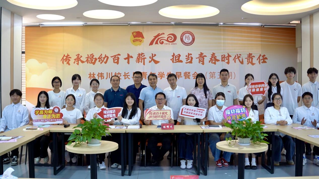 为传承福建幼儿师范高等专科学校110周年办学薪火,搭建师生深度对话桥梁,强化青年学生“知校、爱校、兴校”的责任意识,共同凝聚百十学府的青春力量,校学生会于10月16日早上7:30在仓山校区大食堂到口餐厅开展林伟川校长与青年学生早餐会(第五期)。林伟川校长与来自各学院的17名学生代表围坐共餐,围绕“校史传承、成长发展、校园建设”展开深入交流。校团委、学工部、教务处、后勤管理处、图书馆、现代教育技术中心等部门负责人参会,为学生答疑解惑、共话发展,本次活动由校学生会执行主席谢雨斌主持。