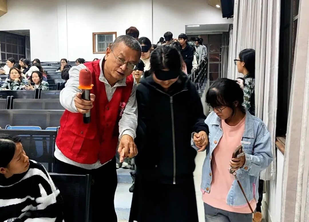 随后林向荣老师从三个方面为同学们带来了精彩讲解:一是与盲人朋友交流时的注意要点,二是带领他们外出的技巧,三是日常生活中的助盲方法。他不仅细致地讲解了每一个环节的具体做法,还现场进行了生动的示范。林向荣老师特别强调,我们应当把盲人朋友当作真正的朋友,而非特殊群体,鼓励大家用实际行动传递爱心,为社会注入更多温暖与正能量。