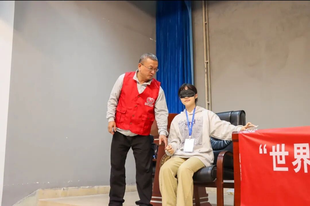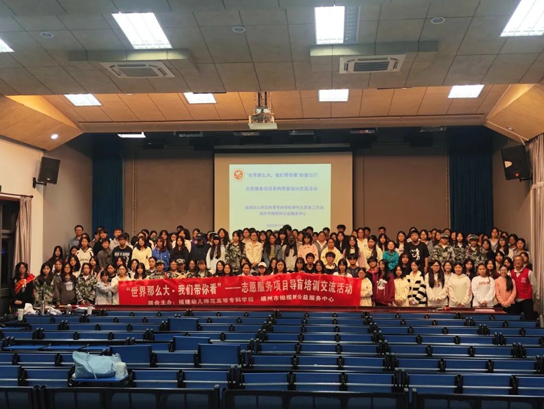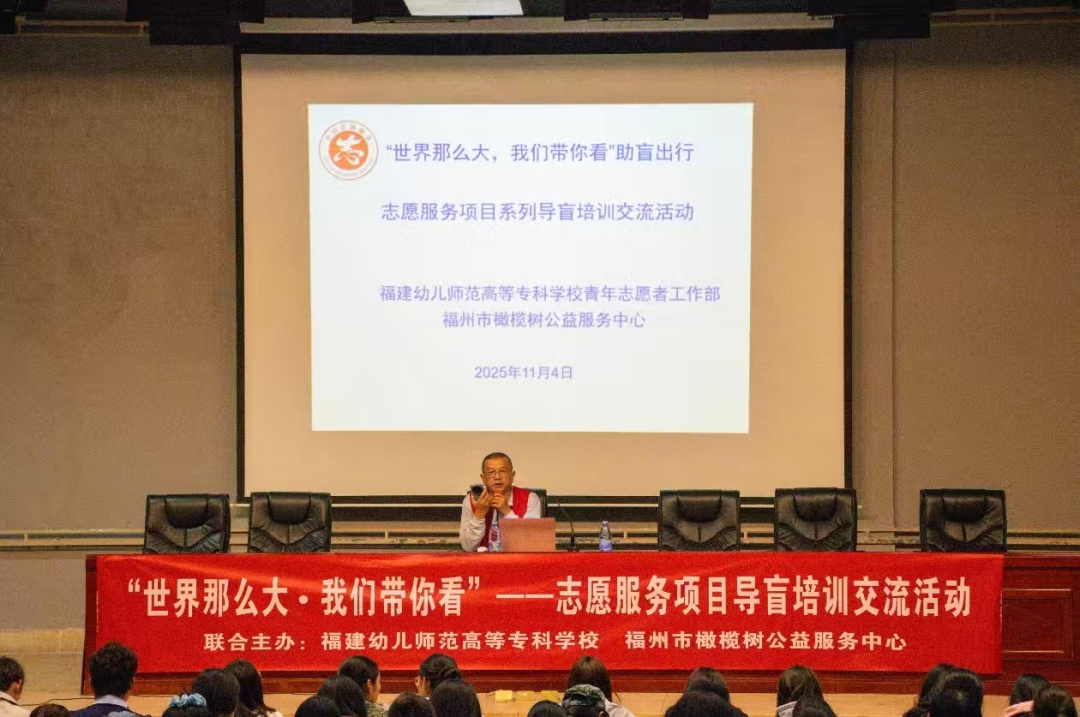 2025年11月4日由福建幼儿师范高等专科学校青年志愿者协会联合福州市橄榄树公益服务中心在图书馆四楼报告厅举办了“世界那么大·我们带你看”助盲出行志愿服务项目系列导盲培训交流活动。