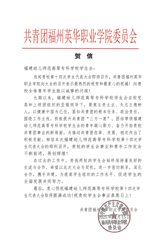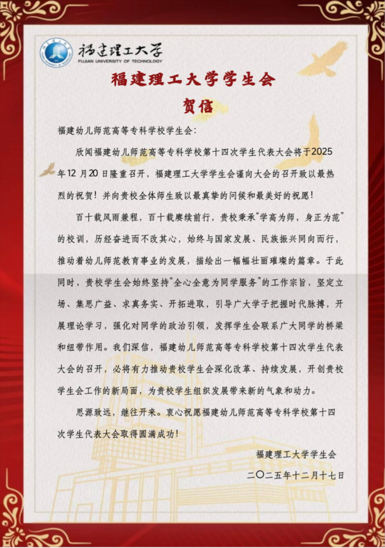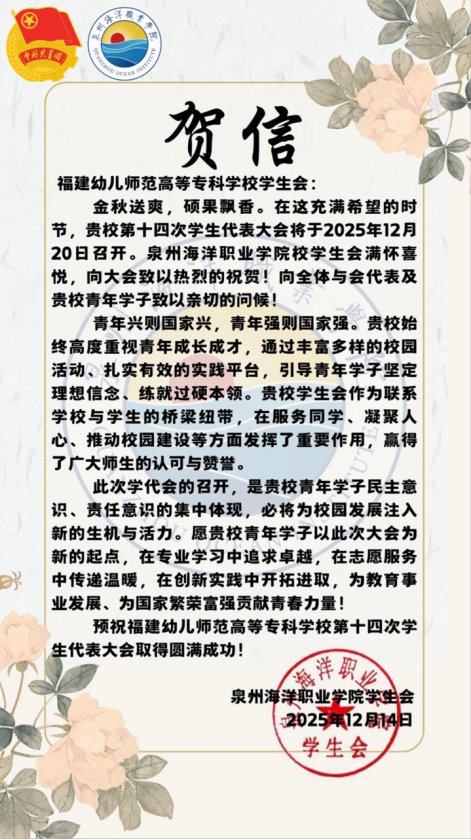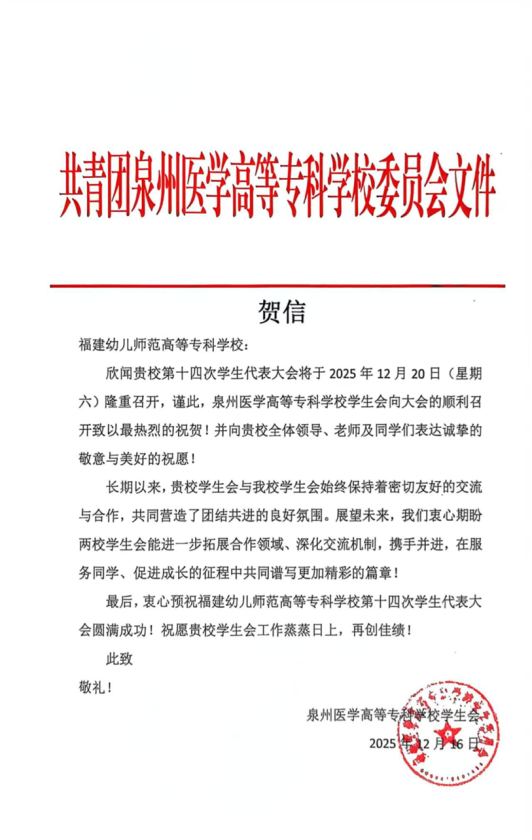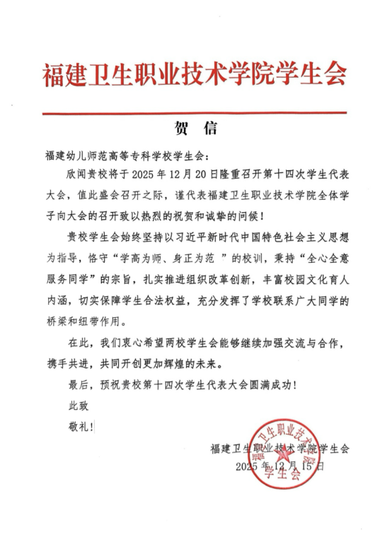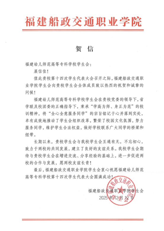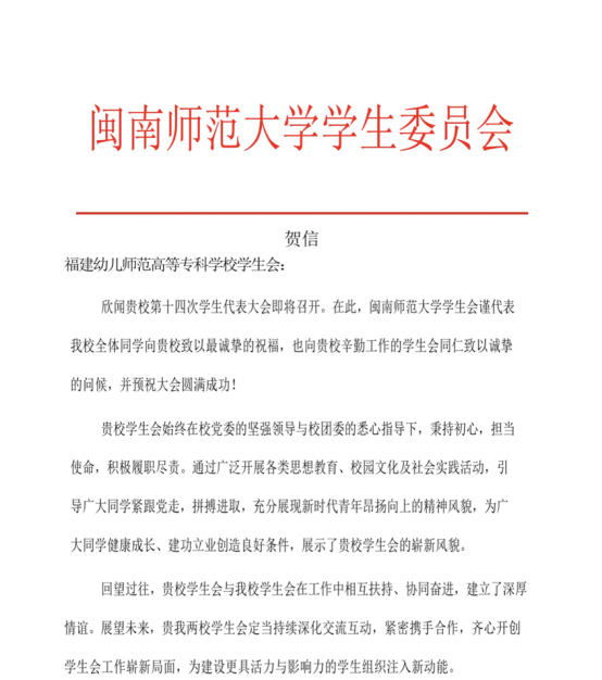 青春如歌,激扬梦想;盛会将至,万众期待。福建幼儿师范高等专科学校第十四次学生代表大会即将隆重召开。这不仅是一次总结过往、擘画未来的重要会议,更是一场凝聚青年智慧、共谋发展的青春盛会。在此,我们向大会的召开表示最热烈的祝贺!“山海不远,情谊相连。”在本次大会筹备期间,我们收到了来自全省各地兄弟院校学生会的热烈祝贺与诚挚问候。