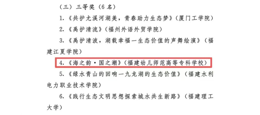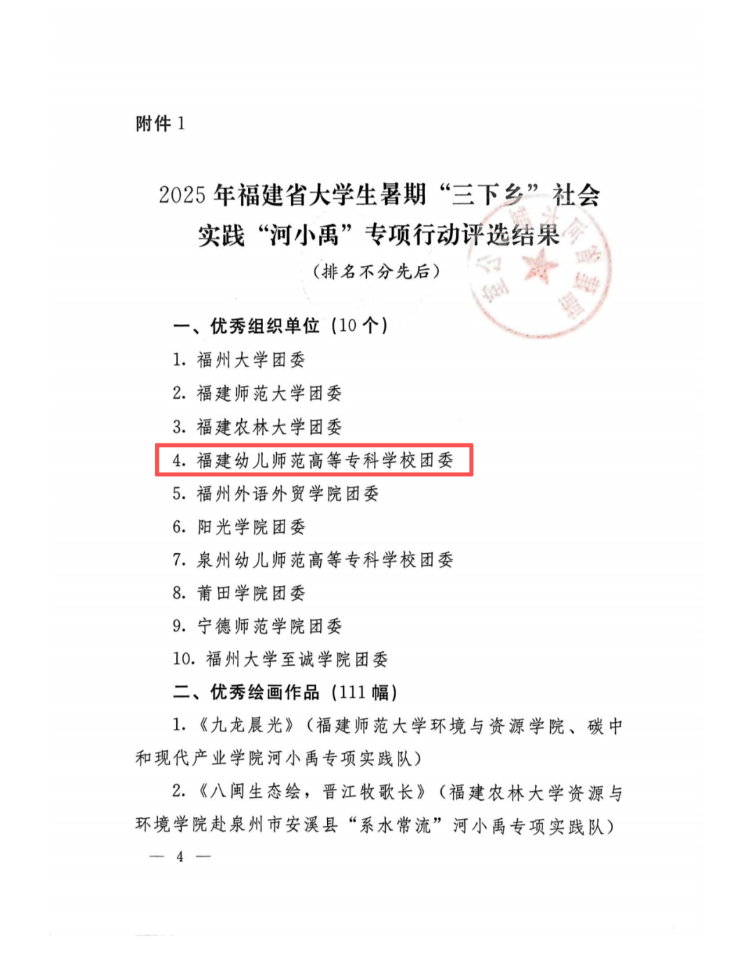 荣获“2025年福建省大学生暑期‘三下乡’社会实践‘河小禹’专项行动”优秀组织单位称号,是全省受表彰的10所高校中仅有的2所高职院校之一。