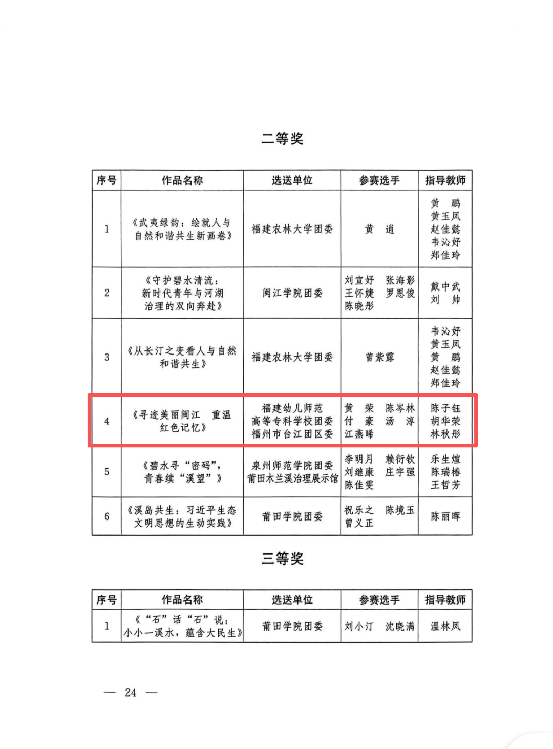 我校与福州市台江团区委联合选送的作品《寻迹美丽闽江 重温红色记忆》荣获视频作品二等奖。该作品由黄荣、陈岑林、付豪、汤淳、江燕晞等同学创作,在陈子钰、胡华荣、林秋彤等老师的指导下完成。