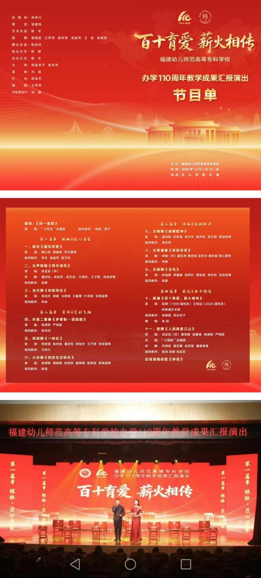12月1日晚上,福建幼儿师范高等专科学校举办"百十育爱 薪火相传"110周年教学成果汇报演出,全体师生以一场艺术盛宴献礼学校百十华诞。来自全国各地的嘉宾、校友,以及我校师生500余人共同观赏演出。本场教学成果汇报演出由校教务处、艺术教育学院承办,由“艺术教育专业群”省级教师教学创新团队、小榕树艺术团组织执行。