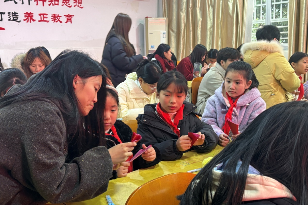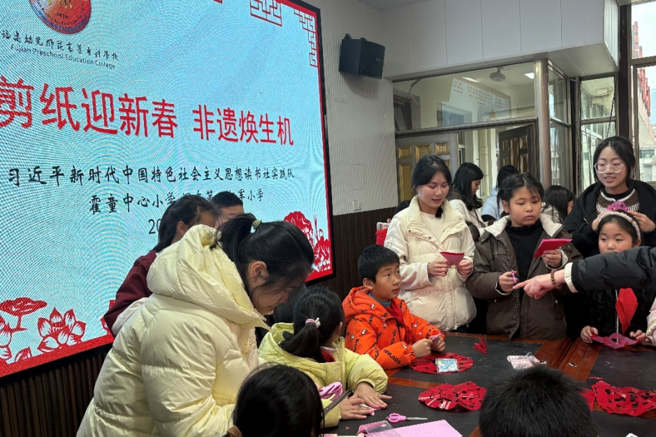 带着从线狮技艺中领悟的“牵引”智慧,实践队最后一站走进闽东第一红军小学(霍童中心小学),开展“剪纸迎新春,非遗焕生机”文化志愿服务活动。队员们化身“小老师”,耐心引导孩子们创作寓意吉祥的窗花。这一过程,正是“师者,所以传道授业解惑也”的现场实践。师范生们在传授技艺的同时,也在孩子们心中播撒下热爱传统文化、向往真善美的种子,亲身践行了“以文化人、以美育人”的师德追求,完成了从文化汲取者到文化传播者、教育启蒙者的角色升华。