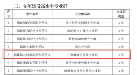 近日,福建省教育厅、福建省财政厅联合发布《关于公布福建省第二期高水平高职学校和专业建设计划立项建设学校名单的通知》,我校“儿童健康与专业群”成功入选福建省A类高水平专业群,成为福建省重点支持建设的高水平专业群之一。