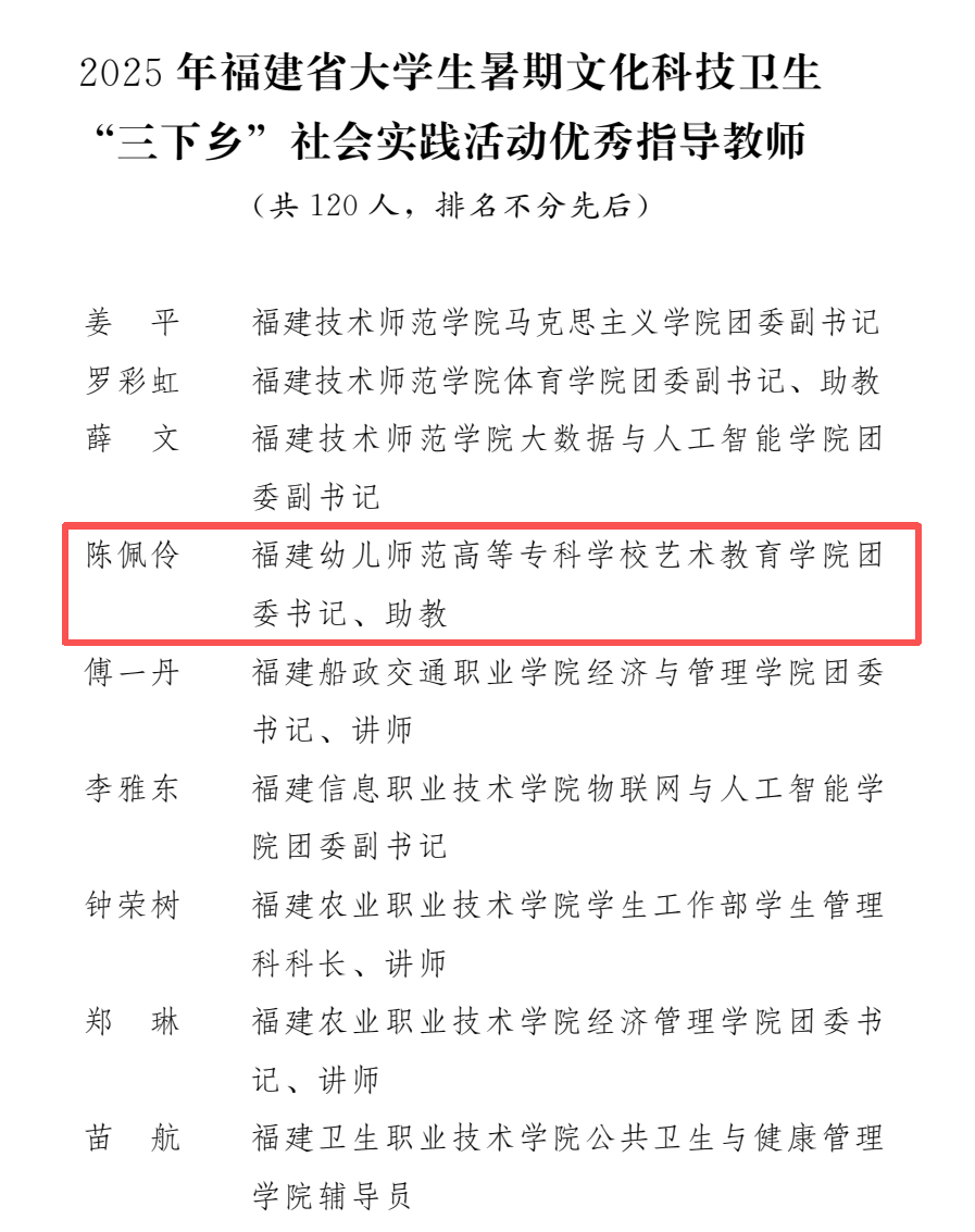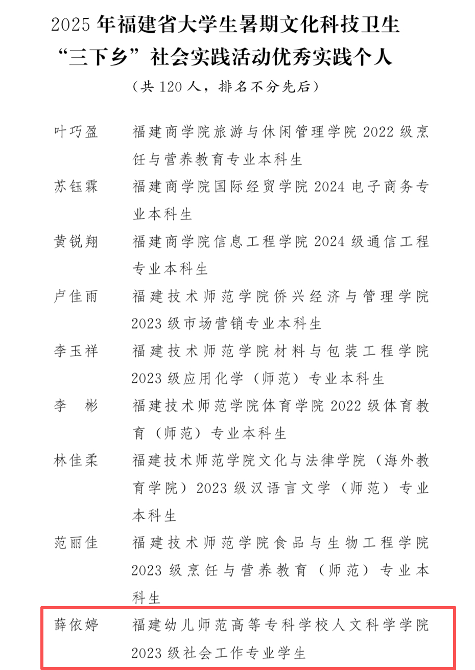 近日,中共福建省委宣传部、省委文明办、省委教育工委、团省委、省学联等十一部门联合发布了《关于2025年福建省大学生暑期文化科技卫生“三下乡”社会实践活动优秀集体和个人的通报》。我校在本次评选中喜获三项省级荣誉,成绩斐然。