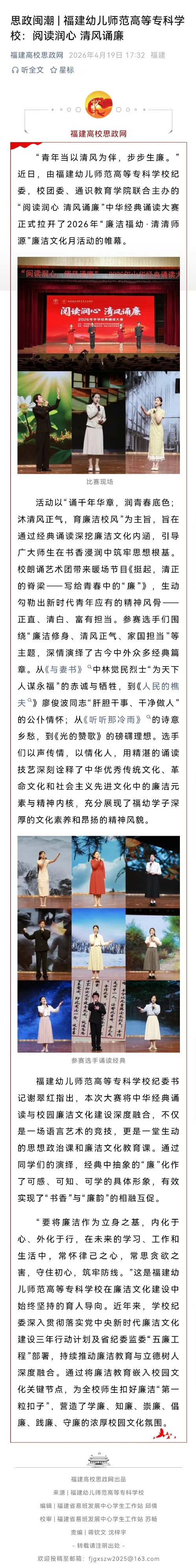 近日,福建省纪委监委官网“五廉工程”专栏、福建高校思政网相继报道了我校“阅读润心 清风诵廉"中华经典诵读大赛。该活动作为"廉洁福幼·清清师源”第二届廉洁文化月的开篇之作,正式拉开了本届廉洁文化月活动的帷幕。