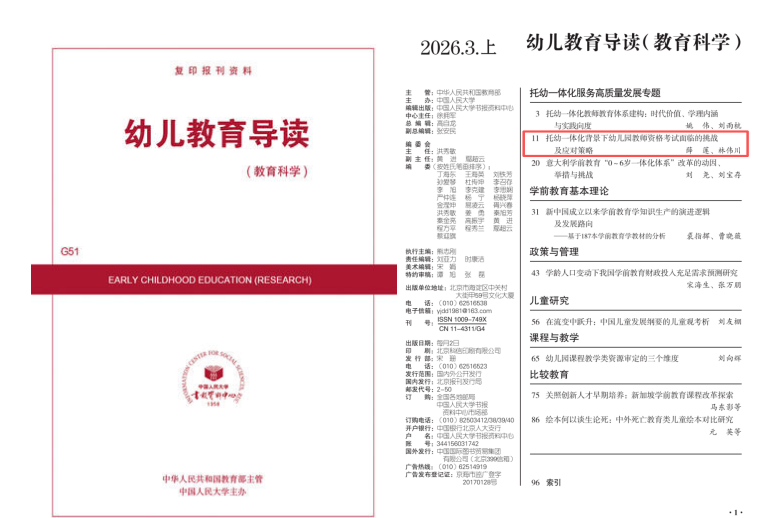 近日,由我校党委书记林伟川教授、薛莲副教授合作完成的学术论文《托幼一体化背景下幼儿园教师资格考试面临的挑战及应对策略》,被中国人民大学复印报刊资料《幼儿教育导读》2026年第3期全文转载。该论文原载于核心期刊《中国考试》2025年第12期,标志着我校在托幼一体化领域理论研究取得重要突破。